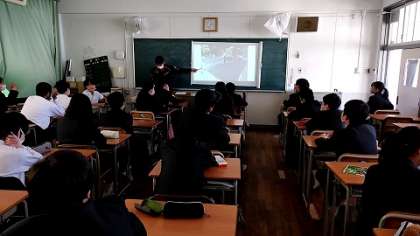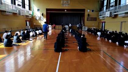 左から順に、1年聴力検査、2年校外学習に向けた学級活動、3年学年集会の様子です。