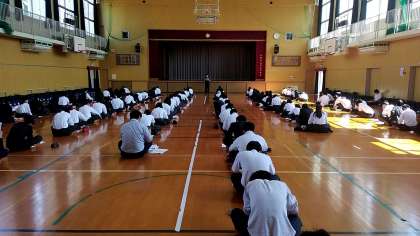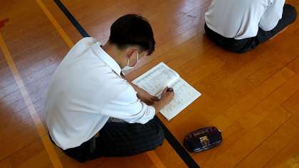 3年生は、明日から始まる修学旅行のオリエンテーションを受けています。生徒たちは、しおりに必要なことがらを記入していました。