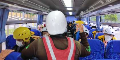 バス車内でインストラクターさんからオリエンテーションを受けています。