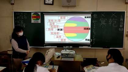 世界の気候区分に関する学習です。模式的に示した地球を、気候区分にしたがい色分けしています。雨温図の見分け方についても学習しました。