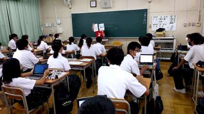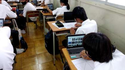 夏休みの宿題(名画の模写)を提出しました。早速、生徒作品を鑑賞しています。その後、1人1台端末を用いて本日の課題に取り組みました。