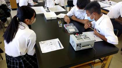 酸とアルカリがリトマス紙やBTB溶液等をどのように変化させるのかや、電解式について復習した後、電気泳動の実験結果をふまえ、考察を深めました。