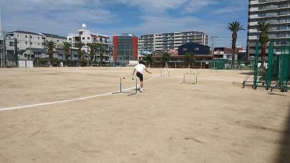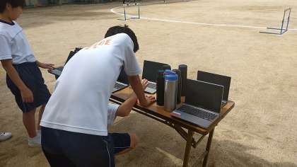 ハードル走の練習です。自分が跳ぶ姿をクラスメイトに動画におさめてもらい、修整点を確かめます。次時の授業で、記録をとる予定です。