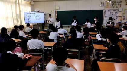 生徒会役員が玉出小学校にお伺いし、電子黒板を活用しながら、6年生の皆さんに中学校について紹介しました。
