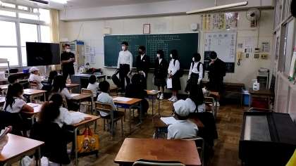引き続き、玉出小学校2年生の教室に生徒会役員がお伺いしました。授業「地域探検」の一環で、玉出中学校について児童の皆さんの質問にお答えしました。