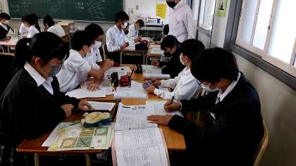 中間テストに再チャレンジ。班で相談しながら、問題に取り組んでいます。