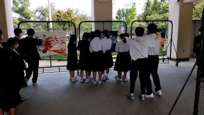 学級応援旗の前に人だかりができています。体育大会の思い出を語りあっているのでしょうか。