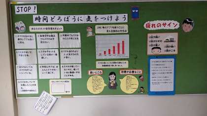 養護教諭と生徒保健委員会が協働して作成しました。スマホとの上手な付き合い方について考えることのできるレイアウトとなっています。