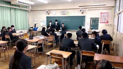 生徒の立場から、より良い授業について話し合った結果を発表します。発表内容を録音すると、ただちに端末上で文字に変換されます。方言などの言い回しを修正し、話し言葉と書き言葉の違いについて学んでいる様子です。