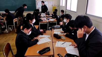 キャリア学習の時間です。自分の長所と短所を客観的に振り返り、将来の適職について各自で考えています。