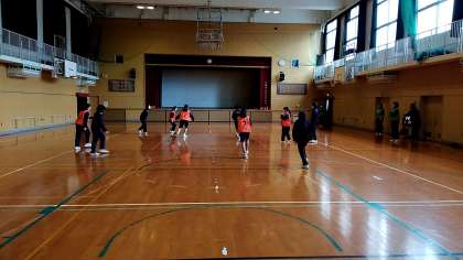 フライングディスクを使いゲームに取り組んでいます。得点を決めた生徒を、他の生徒がハイタッチで迎える姿が印象的です。