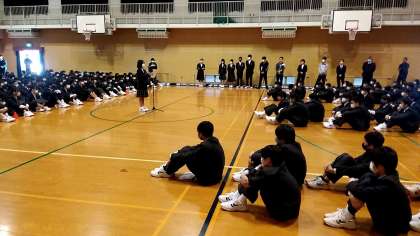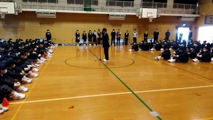 始業式に引き続き、1年生と2・3年生の対面式がもたれました。写真は、それぞれの代表生徒があいさつしている様子です。