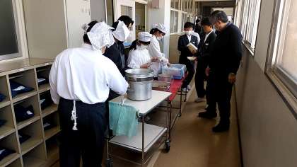 小学校でも経験済みのためか、慣れた手付きで配膳準備を進めてくれているようです。本校の給食は、南津守小学校で調理していただいています。