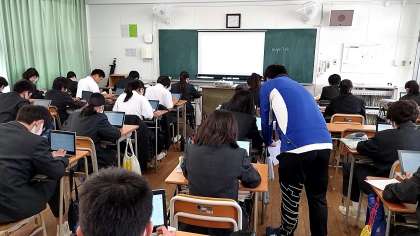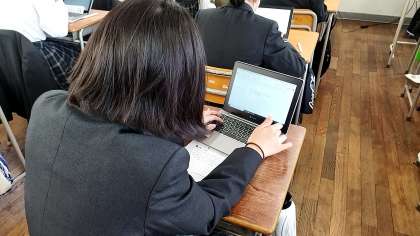 5行ほどの英語の文章を制限時間内にパソコンで入力し、電子送信で先生に提出している様子です。