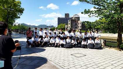 原爆ドームを背景にクラス写真を撮影しました。3年1組です。