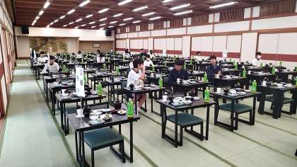 食事係の生徒が着席しています。配膳補助やクラスメイトの座席誘導などの仕事を担っています。