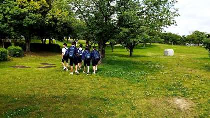 ロゲイニング中の生徒に出会いました。謎解きポイントを求めて、木かげを散策しています。