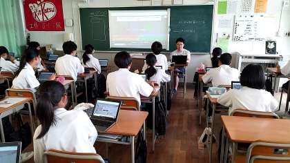 学校のきまりについて、学習者用端末を用いて、クイズ形式で楽しみながら学んでいます。