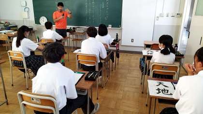 書道の時間です。クラスを二分割し、きめ細やかに指導に当たります。お題は「天地」です。