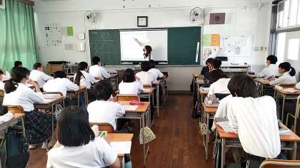 長方形上の一辺と、その一辺以外の辺を移動する点とで形づくる三角形の面積の変化について、1次関数で表すことをめあてとする学習です。終了後、スクールアドバイザーの先生から助言をいただきました。