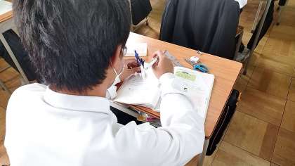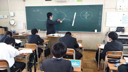 垂直二等分線の作図の仕方を学んでいます。授業前に、担当教員にスクー?アドバイザーの先生からご助言をいただきました。