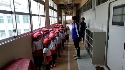 玉出西保育園の皆さんが、津波を想定した避難訓練の一環で本校を訪ねてくださいました。
