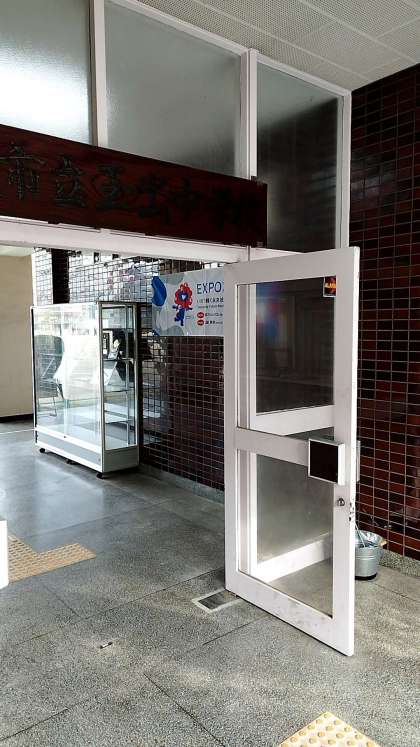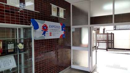 大阪・関西万博の横断幕を玄関に掲示しました。開幕まで500日を切りました。次世代を担う子どもたちが、世界の人々と未来を共に創る契機となることを願っています。