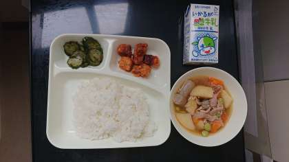 メニューは、まぐろのオーロラ煮、豚肉と野菜の煮物、きゅうりの赤じそあえ、ごはん、牛乳でした。