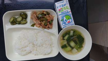 ホイコウロー、中華スープ、きゅうりのピリ辛あえ、ごはん、牛乳が本日のメニューでした。