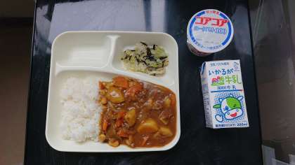 今日は、牛肉と大豆のカレーライス、キャベツのひじきドレッシング、ヨーグルト、牛乳です。