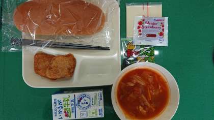 今日のメニューは、一口トンカツ、ミネストローネ、豆こんぶ、スライスチーズ、コッペパン、牛乳でした。
