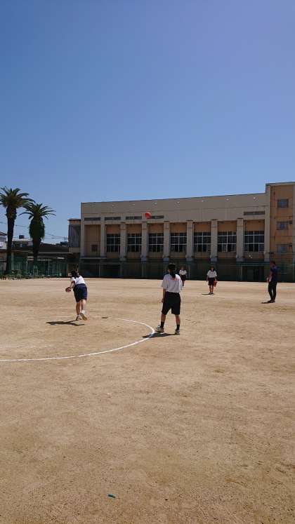 晴天のもと、3年生女子はボール投げに取り組んでいます。