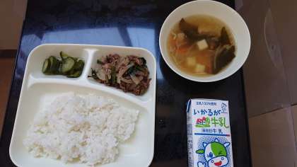 本日のメニューは、プルコギ、豆腐とワカメのスープ、きゅうりの甘酢漬け、ごはん、牛乳でした。