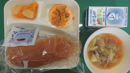 メニューは、豚肉と野菜のカレースープ煮、変わりピザ、ミックスフルーツ、コッペパン、牛乳、ブルーベリージャムでした。