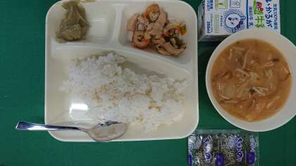 本日は、かやくごはんときざみのり、みそ汁に抹茶ういろうが出ました。