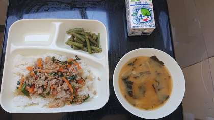 豚ひき肉とにらのそぼろ丼、じゃがいものみそ汁、さんど豆の胡麻和え、ごはん、牛乳です。