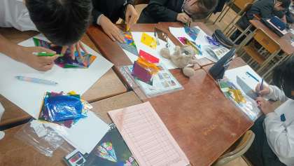 自分で考えたデザインで、カッターを使って切り取っていき、カラーフィルムを貼っていきます。
