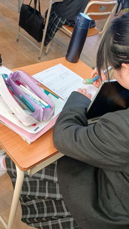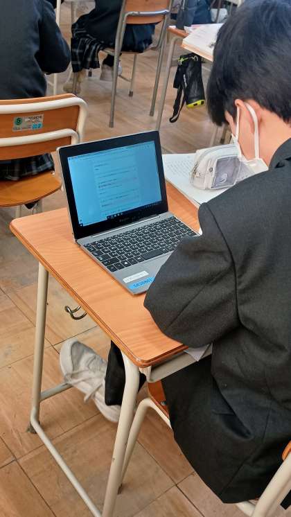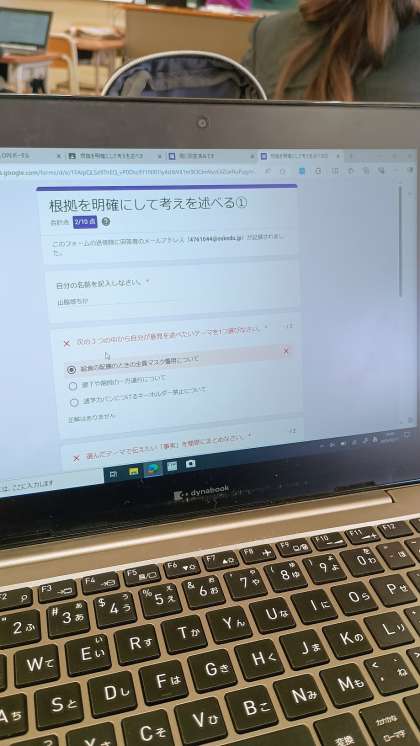 タブレット上で、自分でテーマを選択し、そのテーマに対する事実を並べ、それについてのい自分の意見をまとめていきます。