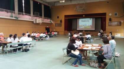 地域防災活動で実績のある神戸市のNPO法人『プラス・アーツ』から講師を招き、中学生28名、保護者6名、玉出・南津守地域防災リーダー20名、本校教員も参加し、充実した研修会となりました。