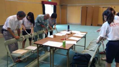 休憩をはさんで、パーティションづくりに挑戦しました。段ボールをカットして、組み立て、避難所設営時に役立つ衝立を班で協力して作成しました。ここでできたパーティションは、本校の緊急時用の蓄倉庫で保管しています。