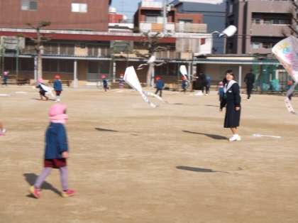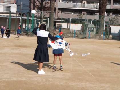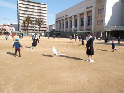 玉出幼稚園の可愛いお友達が中学校にやってきました。中学2年生のお兄ちゃん・お姉ちゃんたちと一緒に楽しく凧あげをしました。グラウンドを所狭しと走り回っていました。お兄ちゃん・お姉ちゃんたちはイイトコ見せれたかな?
