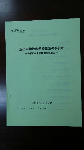 「玉出中学校の学校生活の手引き〜めざすべき生徒像のために〜」を配布し、生徒指導主事の鈴木先生から、玉出中学校における学校生活の心得や学校のきまりについて説明しました。