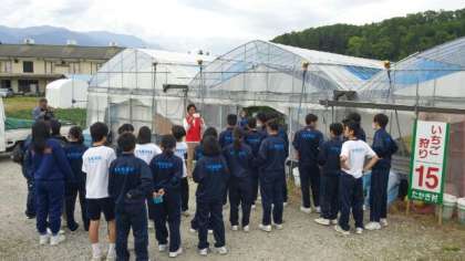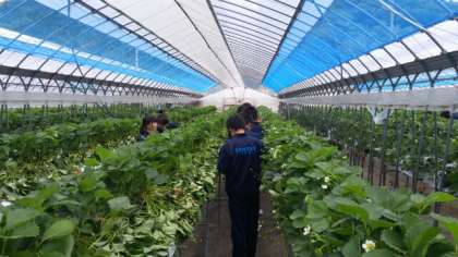 たかぎ村の農園に移動し、いちごの取り方を教えていただき、ビニールハウスの中でいちご狩りを堪能しました。甘くて美味しいいちごを100個以上食べた子どももいるようです。