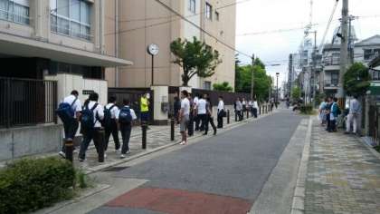 昨日の下校指導に続き、早朝から難波少年サポートセンターや警察OBのスクールサポーターの皆さん、地域の保護司や民生委員の皆さんに協力していただき、先生方とともに子どもたちの登校を見守りました。