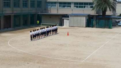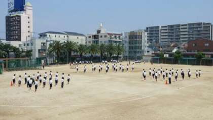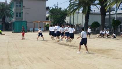 2時間目、女子は大縄跳びの練習、男子は集団演技の練習に取り組みました。
