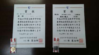 また、ヤンマーフィールド長居で行われた陸上競技の大会では、3年生岡村陸王君が「男子共通 110mハードル」で15秒5の記録をだし、2位に入りました。