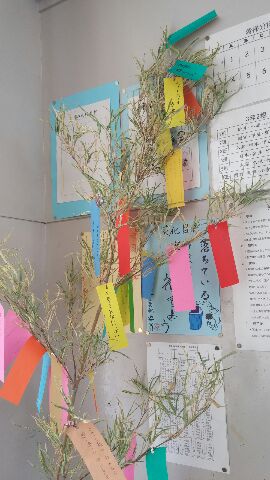 3年生各クラスでは、短冊に一人ひとりの願い書き、笹に飾り付けました。