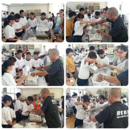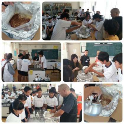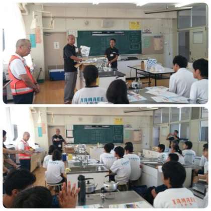 9月30日(土)、土曜授業終了後の午前11時から、「玉出中学校区地域防災対策実行委員会」主催の『中学生地域防災リーダー育成研修会』を本校の調理室・体育館を使って実施しました。