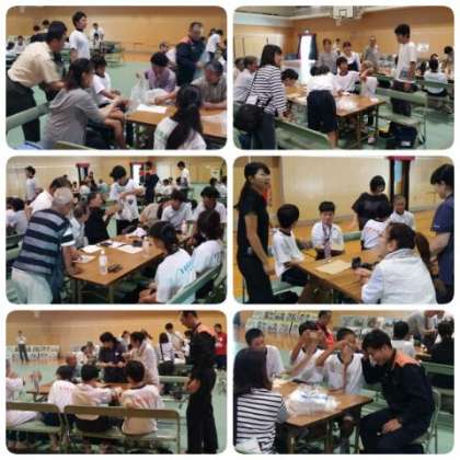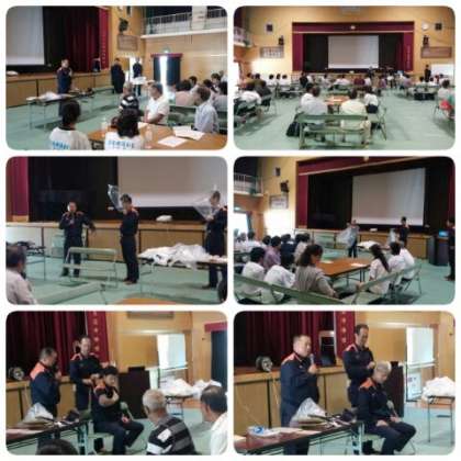 『非常食づくり』の体験調理実習終了後、体育館に移動し、大阪市西成消防署地域担当司令・田中様をはじめ3名の消防士の方の指導のもと、応急処置の体験実習に取り組みました。