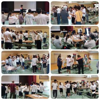 三角巾で包帯を作ったり、腕を固定できるように巻いたり、消防士の方々や地域の防災リーダーの方々に教えていただきながら、中学生は真剣に実習に取り組んでいました。